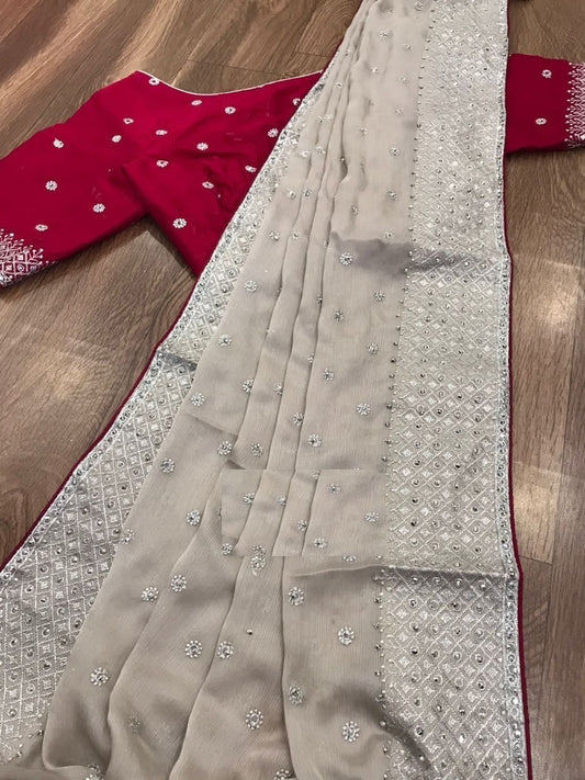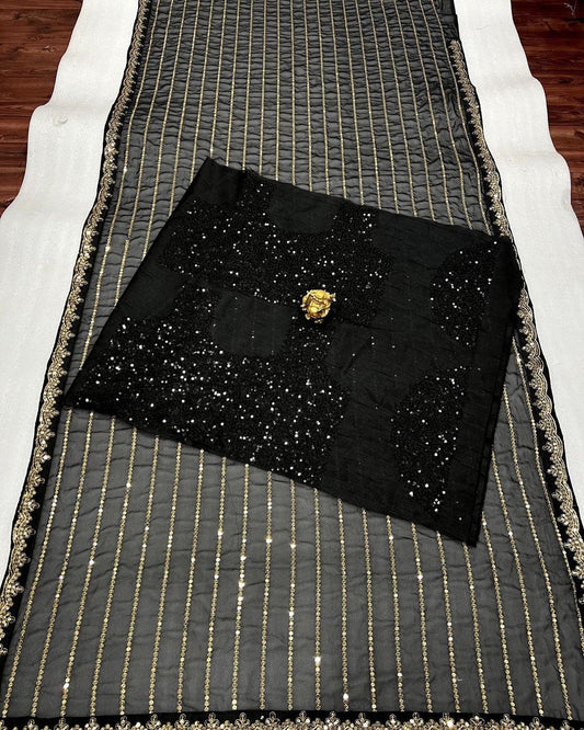 Sari Georgette à l'allure éblouissante avec broderie de paillettes lourdes de 5 mm et élégance en soie