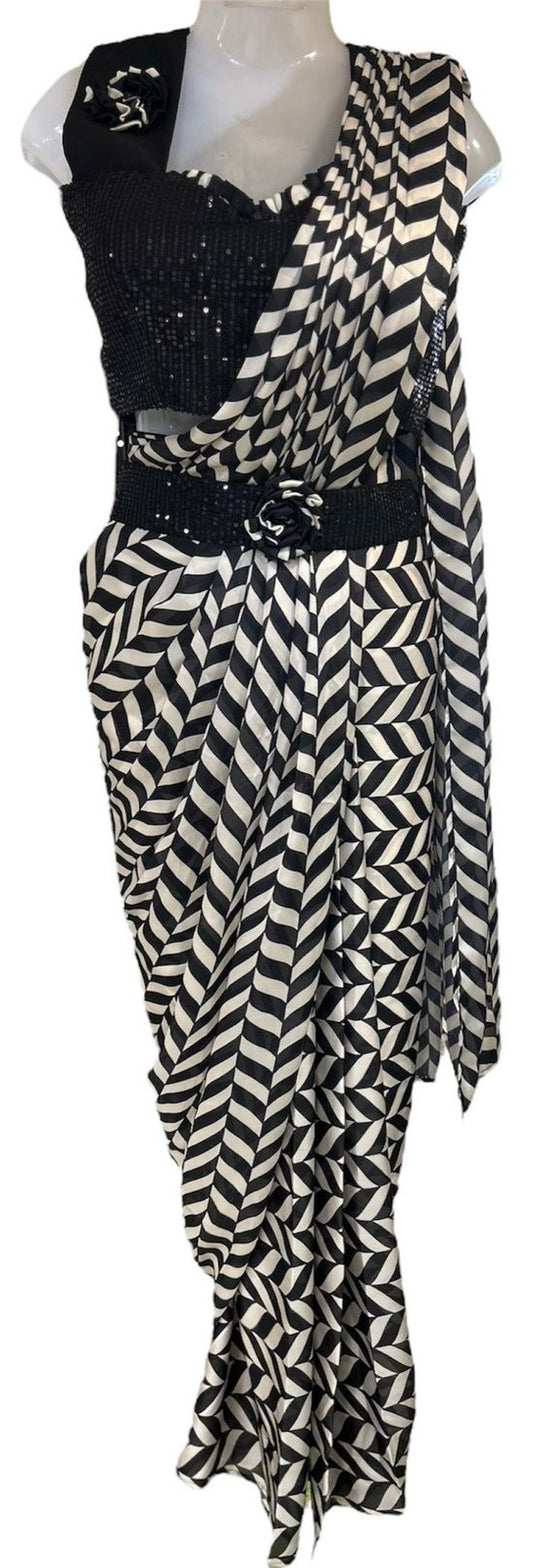 Saree prêt à porter en satin Georgette noir et blanc avec chemisier à paillettes