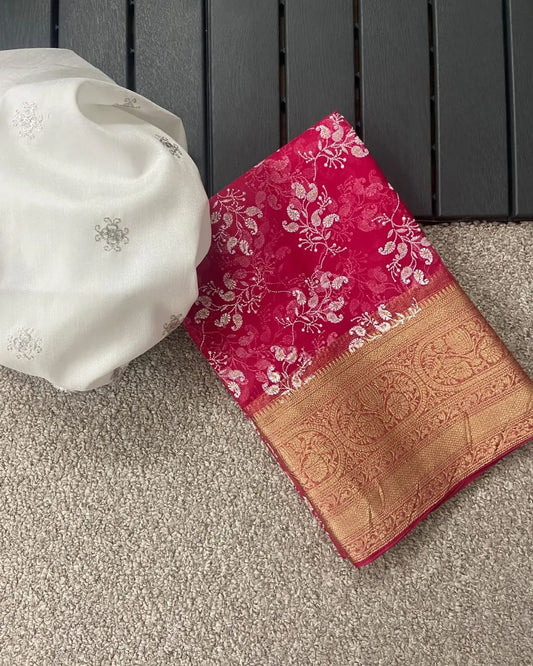 Organza pur or jari Jaqucard bordure partout avec un beau travail d'impression blanc kaddi sari complet