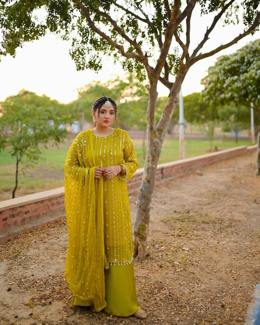 Faux Georgette et séquence de broderie lourde - Ensemble Top-Plazo et Dupatta entièrement cousu