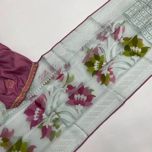 Murmures opulentes : ensemble exclusif de sari en organza avec tissage Braso et chemisier cousu brodé