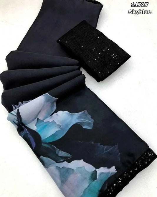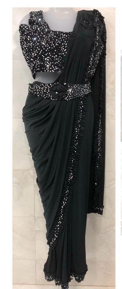 Saree en satin de beauté noire avec chemisier à paillettes noires prêt à l'emploi