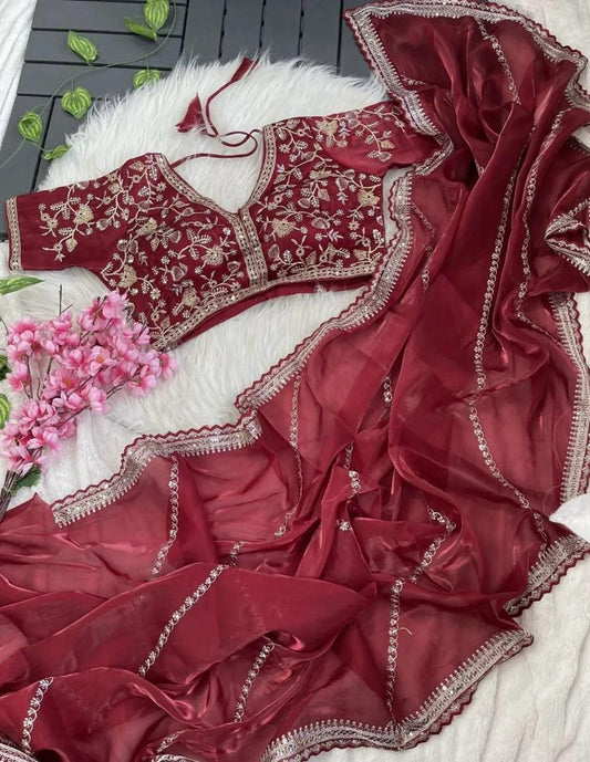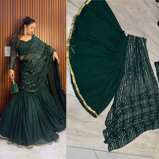 Élégance opulente : ensemble de fausse georgette avec fil, séquence et rivet Moti Work Prêt-à-porter Lehenga Saree pour un glamour sans effort !